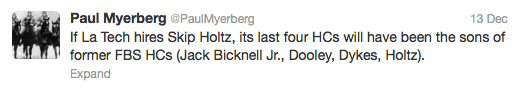 Don't get me wrong. I support Coach Holtz 100%, but his hiring just doesn't make any sense. It seems like our search committee thought that hiring a name would make us relevant instead of sticking with the offensive philosophy that made us relevant. Instead of building upon our reputation as boasting one of the nation's top offenses, we are now known as the school that only hires former head coaches' sons. It's become a joke.