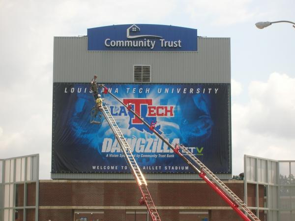 Signage on back of Video Board being installed this afternoon. Parking lot for tailgaters was being marked.