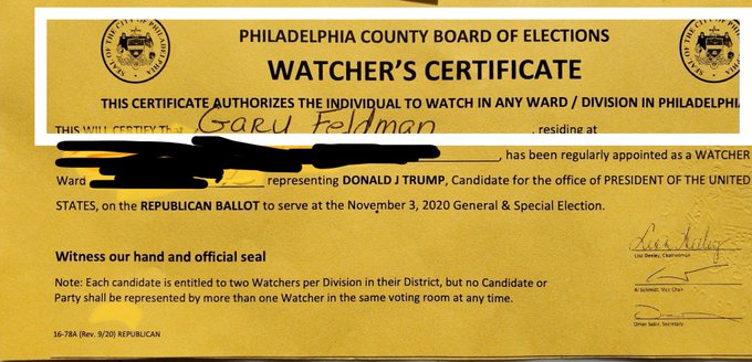 Here’s the poll watcher’s certificateIt makes clear that it allows the holder to watch at any polling place in the city