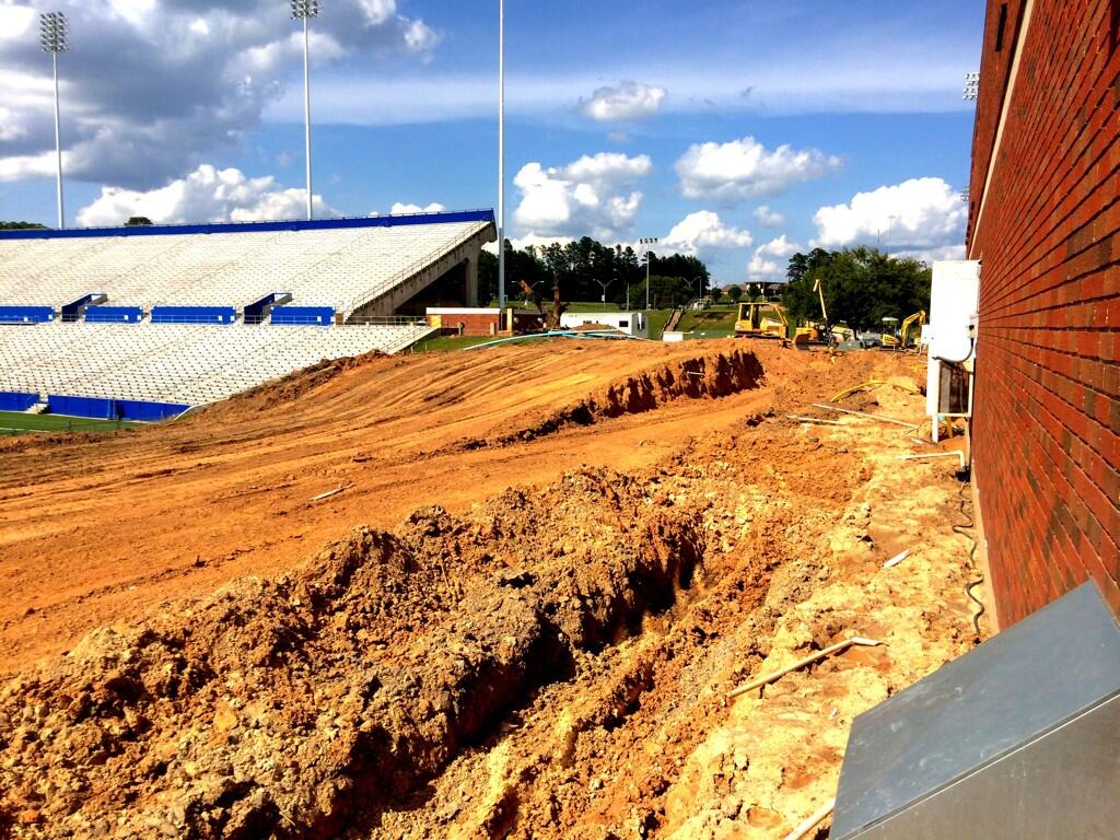 Both sections of metal bleachers on the south end of the stadium are now removed. Work on rerouting the underground utilities which serve the existing building in the south end zone is underway.