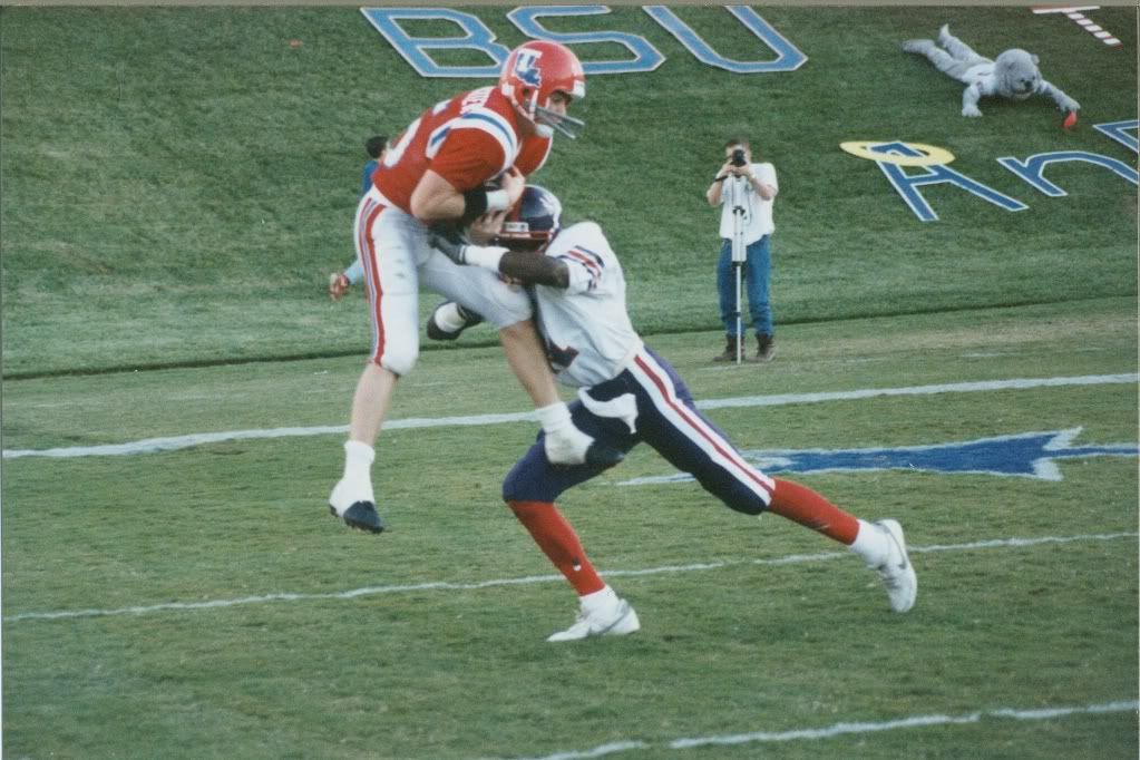 No. 55 Eric Shaw - Tech vs. Colorado State - 1990. The Tech defense was also led by Myron Baker, Lorenza Baker, Artie Smith, Doug Evans, and a host of others. And if you don't think they were a tough group, look at the sticker on the back of helmet in the picture on No. 93.